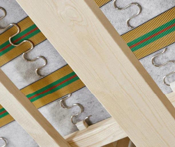 - Frame support system features no-sag springs made from recycled steel sustained by flexible elastic webbing.